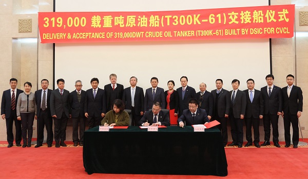 Following the delivery of No.44 180k DWT Bulk Carrier on Feb. 1, 2016, Feb.2 has witnessed the naming and delivery of No.61 319k DWT VLCC Kaisaconstructed for China Merchants Group by DSIC. This carrier has realized sea trial 91 days ahead of the annual schedule and reached to a state of zero pending item before delivery. China Merchants Group Board Director Shi Wei, China Merchants Energy Shipping Co.,Ltd. GM XieChunlin, and DSIC leaders Liu Zheng, CaiZhuyi and Deng Changlian were present at the naming and delivery ceremony.