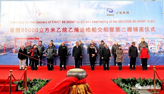 On Jan.15, 2019, the delivery ceremony for the world first 85000m³Very Large Ethane Carrier(VLEC) and keel laying ceremony were held in DSIC Offshore Engineering Company, where Jaccar Chairman York, DSIC leaders Liu Zheng and Yin Xuelin, and more than 100 guests domestic and abroad attended the ceremony.