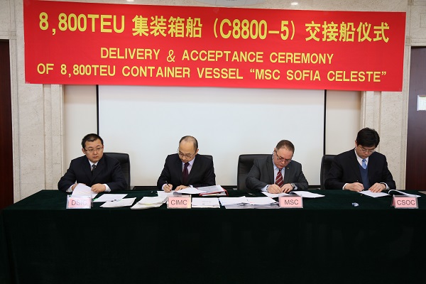 On Nov. 23, No.5 8800TEU Container Vessel of “MSC SOFIA CELESTE”, constructed for CIMC Financial Leasing and MSC by DSIC, was named for delivery, where it only took 5 days to complete sea trial, setting another record of shortest sea trial period in the same serial of vessels. The representatives on behalf of MSC, CIMC Financial Leasing, CSOC and DSIC signed the delivery and acceptance protocol accordingly.